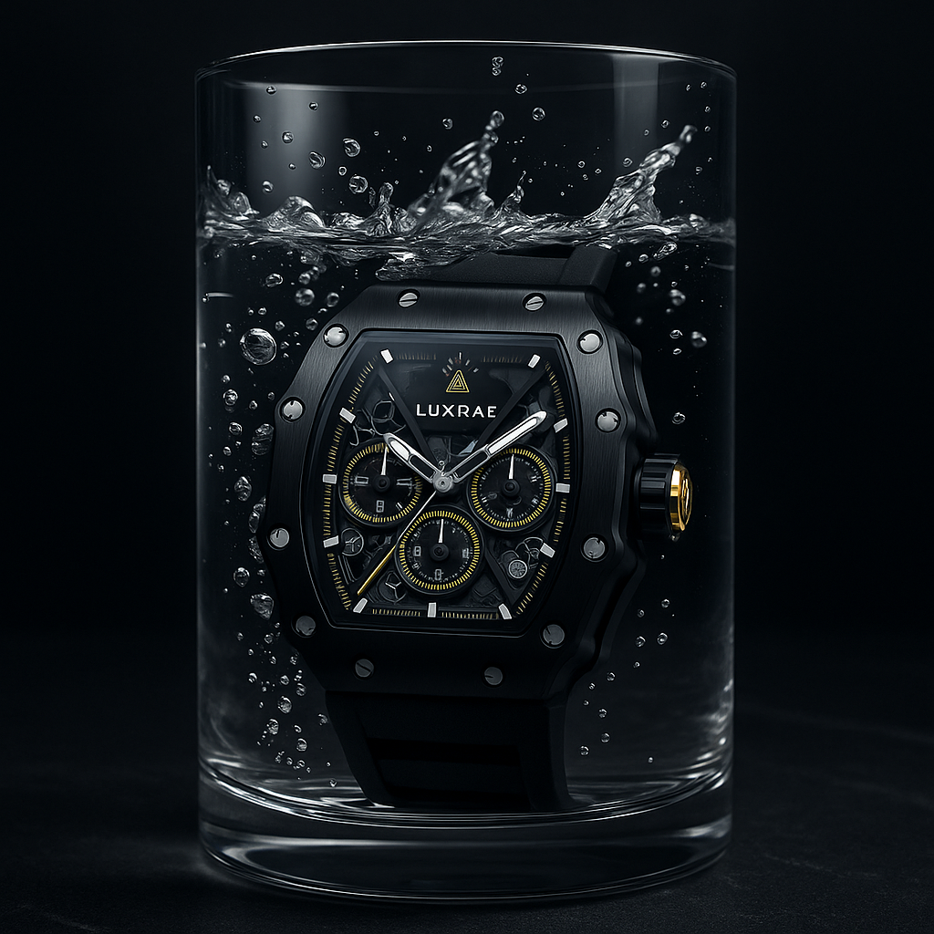 Step into timeless style with the Luxrae Imperium Black Edition, a bold chronograph designed for men who value strength, precision, and understated luxury. Featuring a matte black stainless steel case with polished screws, golden detailing on the dial, and a durable rubber strap, this timepiece is more than an accessory — it’s a declaration.
